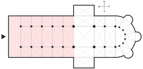 出典:en.wikipedia.org身廊(nave)の例(配色部分)naveには後方部の壁から翼廊前までという意味もある