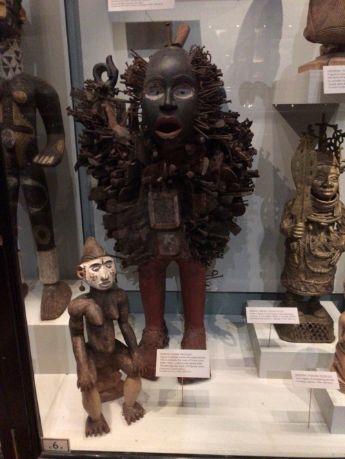 展示物はどこかの部族の魔除けや人形、お面、武器、アクセサリーなど。間近で見るとギョッとしたり、ゾワっとしたり、一人で見るとちょっと怖い。