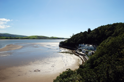 ドゥイリド川(River Dwyryd)が河口に流れ込む際にできる三角江(さんかくこう)にあるポートメイリオンは、潮が引くと5km以上先の対岸まで陸続きになる入り江を見下ろす崖の上に広がっています。近郊には、ウェールズ西海岸の港町ポースマドッグ(Porthmadog、約3.2km先)、 ミンフォルズ駅(Minffordd station、1.6km先)、スノードニア国立公園(Snowdonia National Park、約34km先)があります。