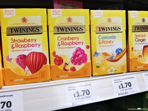 チェーン展開している「セインズベリーズ」は、庶民的な町のスーパーといったイメージです。とはいえ、ロイヤルワラント付き(王室御用達)の紅茶で、日本でもおなじみのトワイニングもあります。しかし日本では見かけないフレーバーティーも豊富で、いろいろ欲しくなってしまいます。