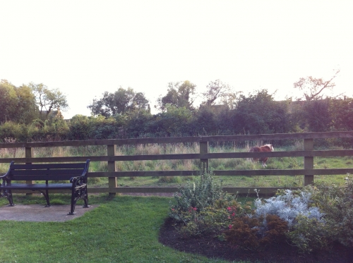写真:NozCod Beck - riverside walk (コッド・ベック川と小川散策路)の途中にある私有地にいたミニホース。通り過ぎるまで横に並んで歩いてくれました。