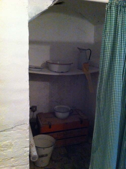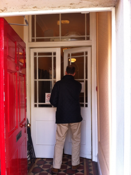 高い天井から吊り下がるライトの緩い明かりが壁のクリーム色を照らして、とても暖かい気持ちになる空間です。支払いに来た農場主がドアを叩く様子や、往診から帰ってきたヘリオット先生が壁にコートを掛ける姿が目に浮かぶ空間です。