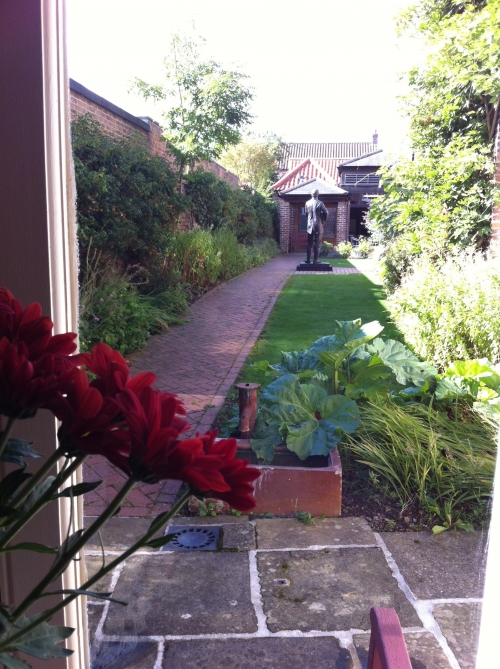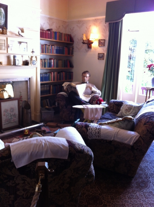 廊下を挟んでダイニング・ルームの向かいにあるのは、家族が団欒の時を過ごした広い居間です。壁一面に広がる大きな窓の外には、お庭が広がっています。写真左の炉棚の上にあるのは、ビアグラスに蓋が付いたような形の金属製のタンカード(ビアマグ)。その日の売上を詰め込むヘリオット先生の共同経営者・シーグフリードの姿が目に浮かびます!