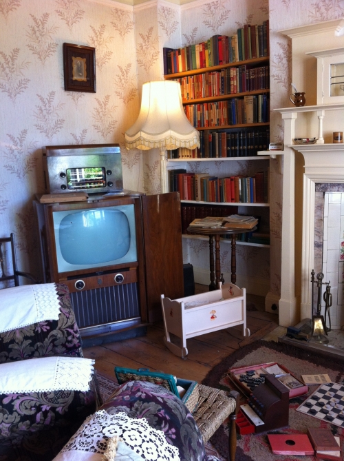 居間には暖炉を囲むように置かれた大きなソファーや、床に広げられた子供のおもちゃ、テレビやラジオ、本棚と読書ランプなどが身を寄せ合うように置かれ、家族がみな思い思いの事をしながらも、同じ空間で一緒に時を過ごした憩いの場所であることがうかがえます。