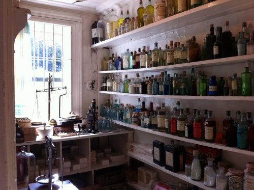 台の上には顕微鏡や天秤はかりがあり、壁の棚にはワイト氏が活躍していた時代に使用されていた薬の瓶や箱がビッシリと並んでいます。