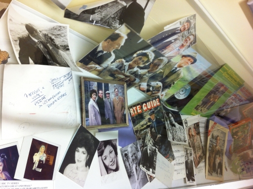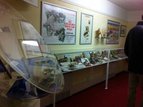 ワイト氏の著書であるヘリオット先生シリーズは、本や絵本などの書籍のみならず、それらのストーリーを原作にした映画やテレビシリーズも作られました。この展示スペースには、ワイト氏が作成した原稿や数々の著書、ストーリーに登場する動物やシーンをモデルにした置物や絵皿などのギフト商品、映画やドラマの広告ポスターやレコードが展示されています。