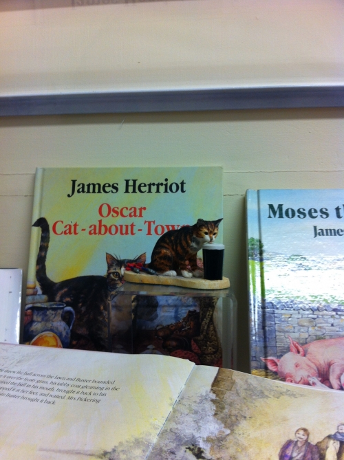 左上の写真は、人が集まる教会やパブなどを好んで訪れたオスカー(Ocar)という猫の物語を書いた絵本と、モチーフにした置物。右上の写真は、『みなしご羊ハーバート』というサフォーク種の子羊の物語の本とその置物です。