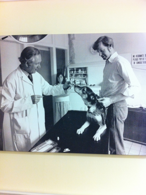 写真:Nozヘリオット先生のモデルのワイト氏(写真向かって左)。診察台の上の犬に注射をするところのようです。