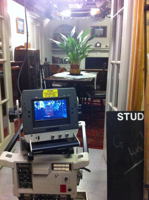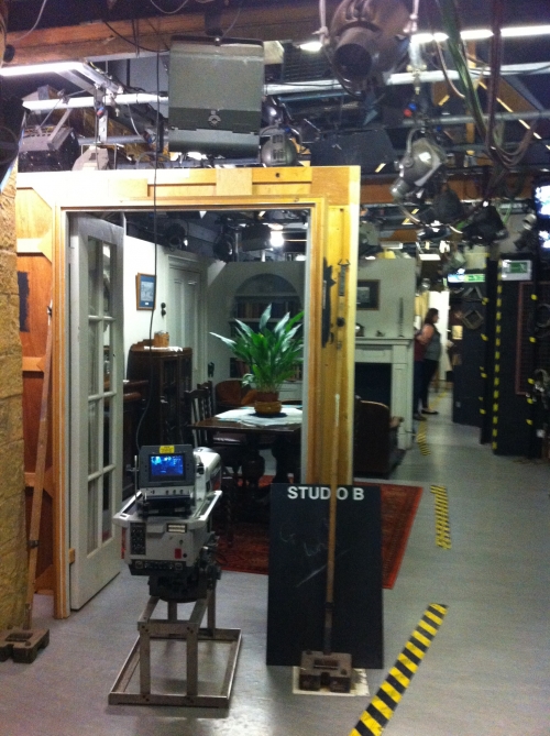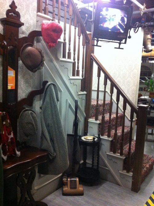 キッチンの裏にあたるこのスペースには、約40年前、バーミンガムにあるPebble Millスタジオで撮影に使用されていたエントランスや居間、診察室のセットが撮影機材ごとそのまま再現され展示されています。忠実に再現されているため、今にも撮影が始められそうな雰囲気です。