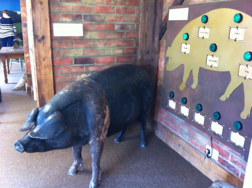 2階に上がると、広いスペースに置かれた牛や豚の実物大模型や、クイズに答えて遊ぶ遊具などがある体験型ギャラリーがあります。