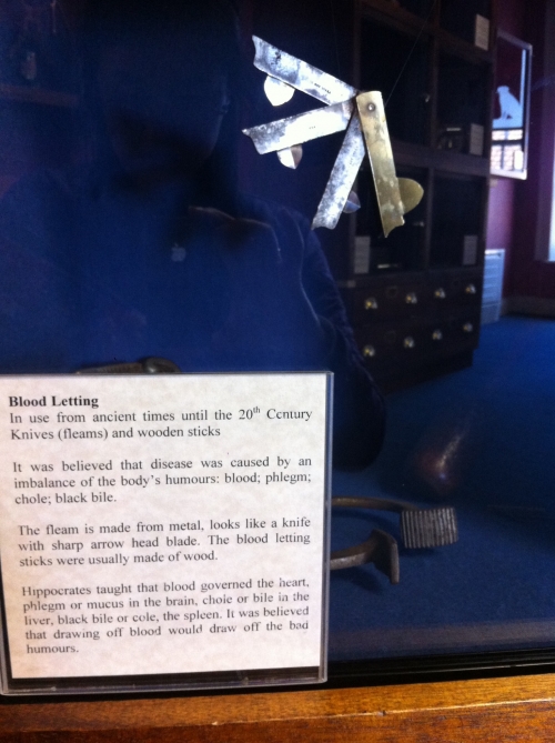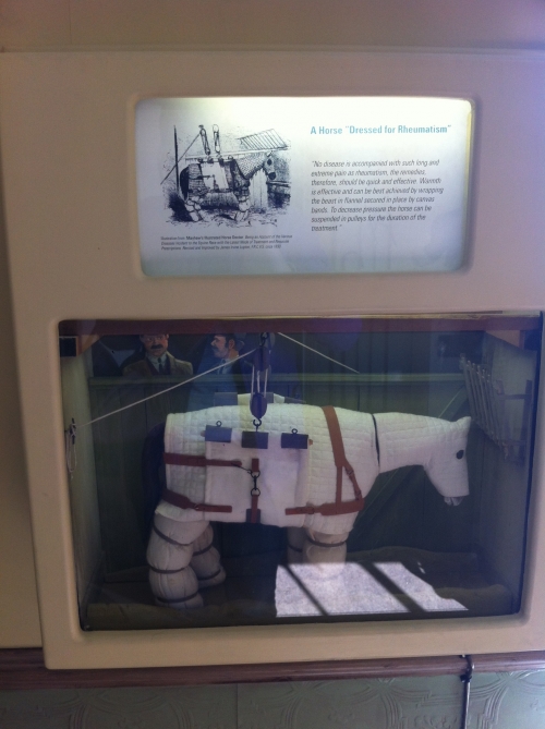 昔は悪い血が原因で病気になると考えられていました。左上写真の器具は、悪い血を出すためにわざと出血させる処置に使用されていたそうです。右上の写真は、馬のリウマチを治療している様子です。馬を温めるために全身をキルトで包み、重力による負荷を軽くするためにベルトで吊り下げています。