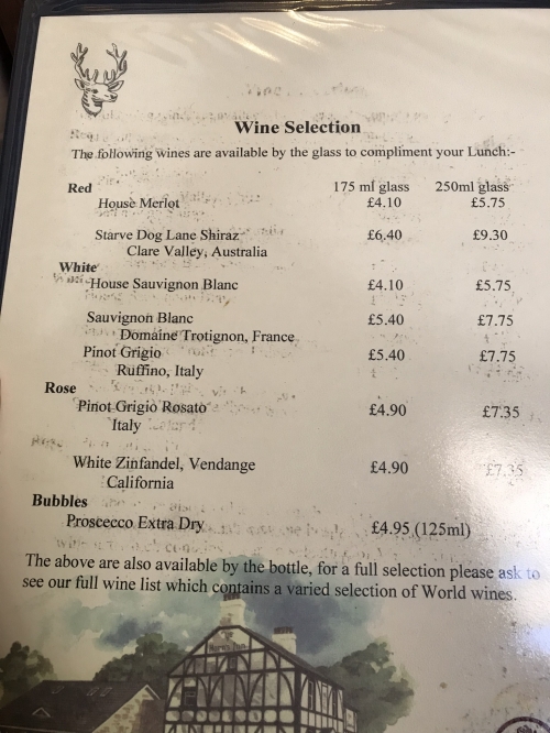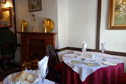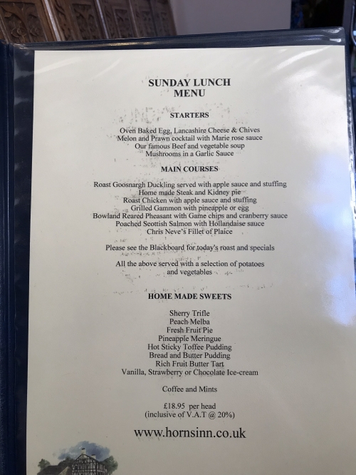 Ye Horns Innのサンデー・ランチはパン、前菜、メイン、デザートにコーヒーが付いたセットメニュー。前菜、メイン、デザートは各数種類あり、自分の好きな物をメニューから選びます。全てが付いて£19,95(2,992円)で頂けるお得なコース。また、12:00~18:00までオーダーが可能なので、早めの夕食としても頂く事が出来ます。