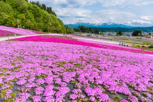 「魚沼の里山公園の創出」をテーマにした公園。一番の見所は芝桜広場です。例年5月中旬に見頃を迎え、1ヘクタールの敷地が赤やピンク、白の芝桜が絨毯を敷いたように園内を彩ります。芝桜広場には展望デッキがあり、高所から見渡す芝桜は圧巻!また初夏にはクルミ川で蛍を見ることができます。園内には自然観察遊歩道が整備されており、豊かな自然の中を散策できます。