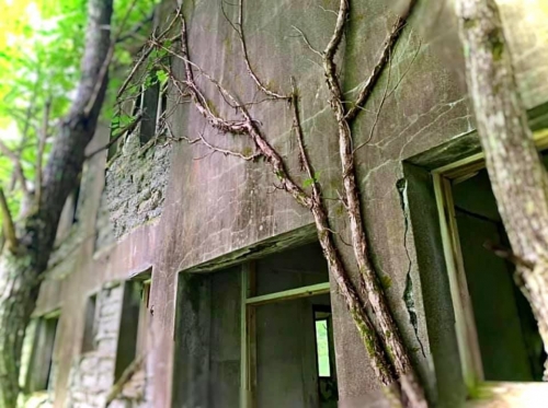 コンクリート造りの建物が3棟並んで建っていて、老朽化で崩れている様子が廃墟好きの心を鷲掴みにします。