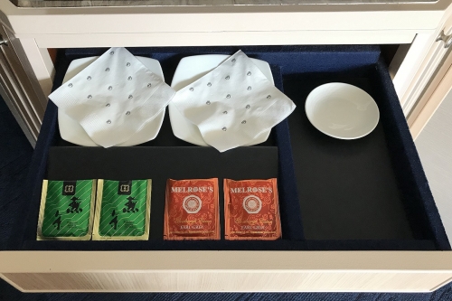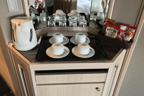 客室内には、自由に楽しめるアルコールを含むドリンクとスナックが用意されています。