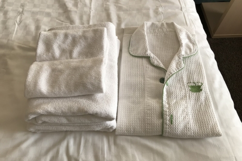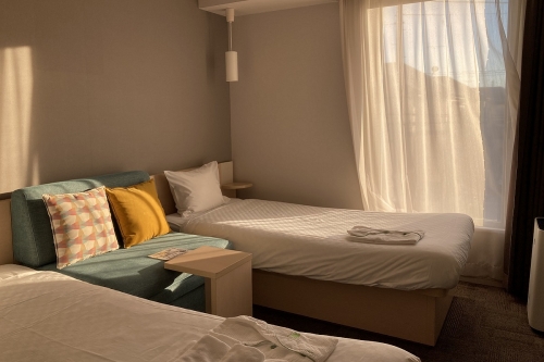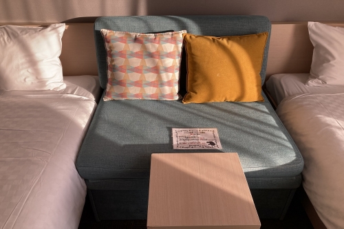 スタンダードツインの部屋は、ソファーとテーブルを挟んで2つのベットが並んでいます。定員3名となっており、3名で宿泊する際はこのソファを展開し、ベットとして利用します。