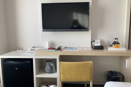ベットの対面には、壁掛けのテレビと机があります。机は広いので、PC作業など余裕を持って行えます。また、くしやカミソリなどのアメニティも置かれており、机の下には小型の冷蔵庫やポットなどがあります。