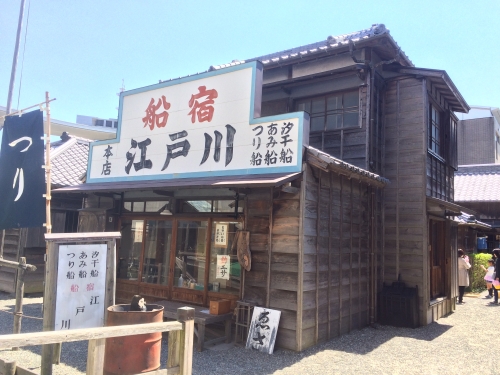 屋外展示場に再現された境川には、3艘のべか舟が浮かんでいて、決められた時間になると、実際に乗ることもできます。べか舟の上から眺める町並みには、粋な佇まいが感じられます。