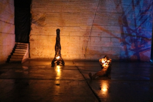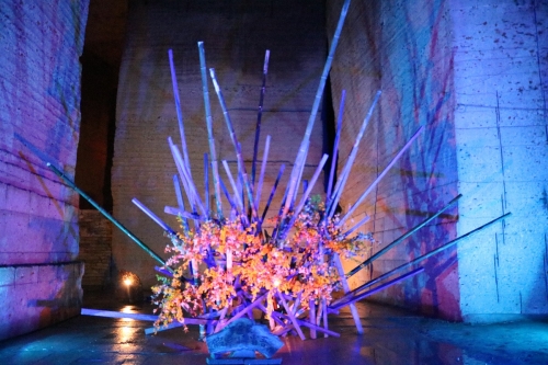 入館して階段を下りると、神秘的で巨大な空間が目の前に広がります。かつてこの地方の特産であった大谷石の採掘場は、巨大な空間やその景観を生かして音楽のプロモーションビデオなどの撮影に使われたり、アート作品を展示する空間として利用されています。