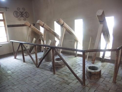 先ほどの靭皮を臼に入れ、杵でひたすら叩いて繊維をほぐします。この杵の動力になっているのが、工房の外にある水車。サマルカンドペーパーの全盛期には400基あったということですが、現在は1基が4つの杵を動かしています。