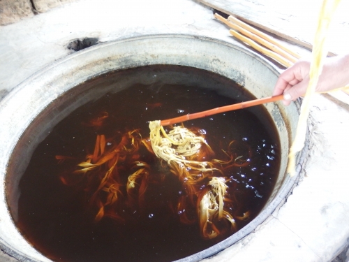 紙作りに使うのは、かたい皮の内側にぴったりくっついていた、この柔らかい皮(靭皮)です。これを煮込むと、縦に走っている繊維が柔らかくなり、ちぎれやすくなります。これが、紙の繊維になるというわけです。