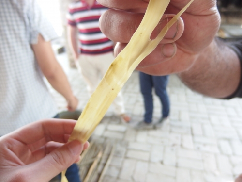まず、紙の原料となる桑などを蒸します。こうして柔らかくなった表皮を枝からはがします。はがした皮のうち表面のかたい部分だけをナイフで取り除きます。