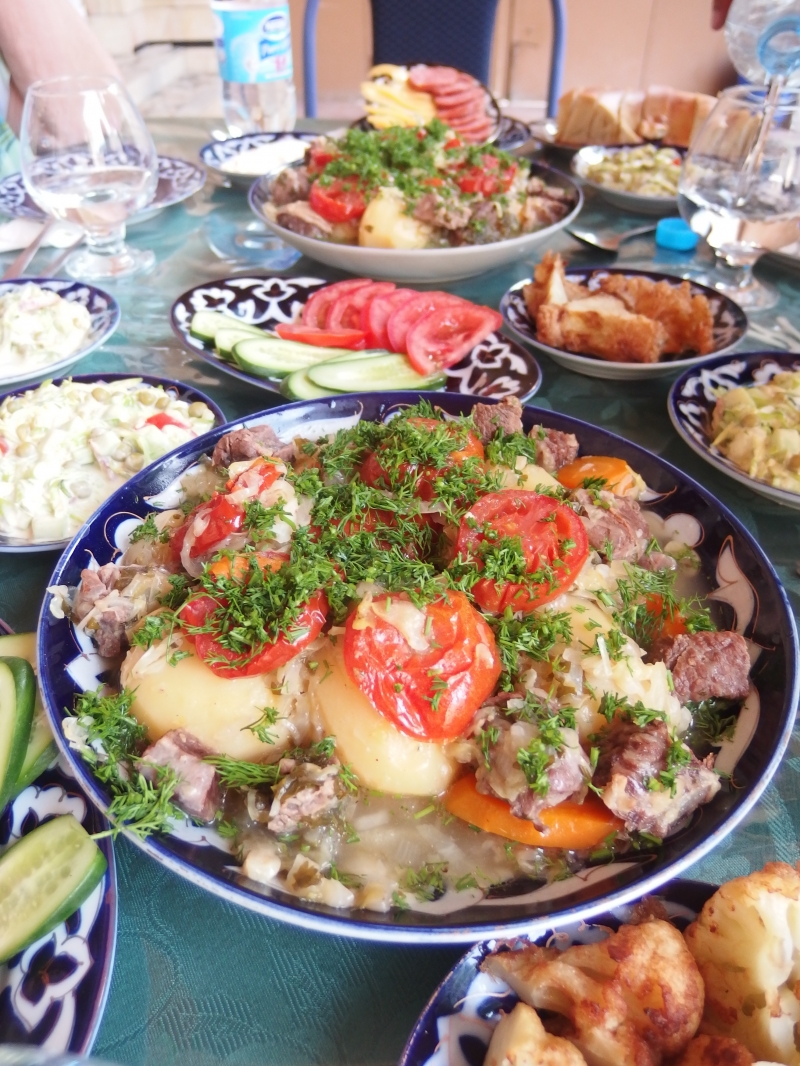 ウズベキスタンでは生野菜のサラダはあまり見かけませんが、テーブル中央にあるようなキュウリとトマトのフレッシュサラダはよく食べられていました。