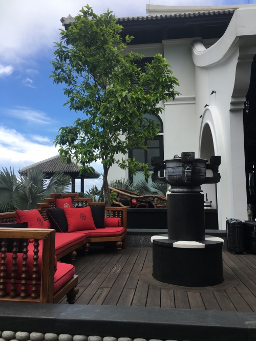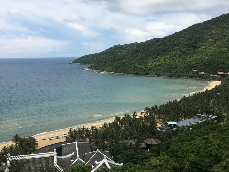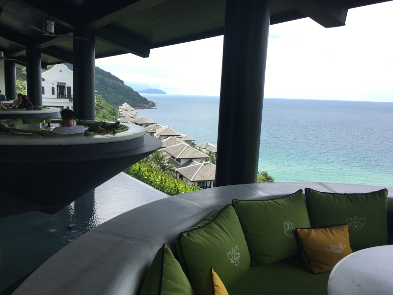 インターコンチネンタル・ダナン・サンペニンシュラ・リゾートは、ダナンベイに突き出たソンチャー半島の突端にあり、山肌に建つ高級リゾートホテル。眼下には静かな入り江に700mにわたるプライベートビーチが広がり、その絶景を眺めながらの食事は優雅と言う他ないのですが、極めつきがこのテラス席(プライベートブース)。