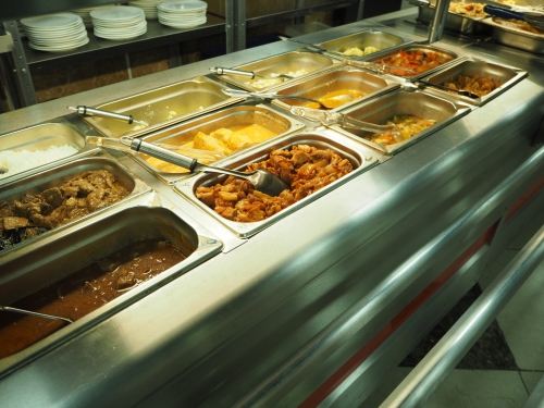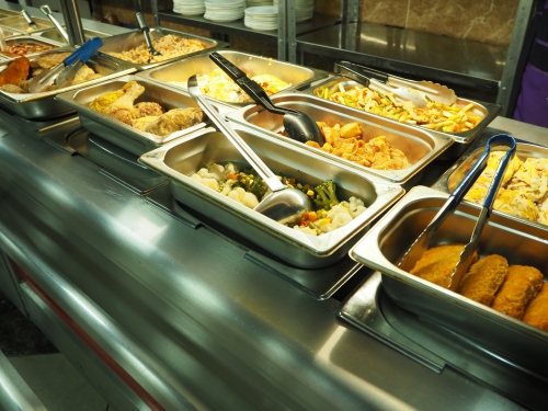 食事はセルフで選ぶスタイル。トレーやフォークヤスプーンを最初に取り、進んでいきます。前菜・スープ・メインの順に並んでいます。