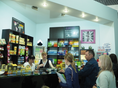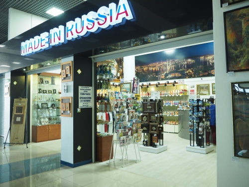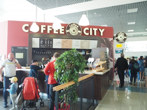 空港は2階構造です。到着ロビーとチェックインカウンターがある1階にはマトリョーシカなどの民芸品を売るお土産屋さん、シーフードや肉製品を販売するお店、ちょっとしたものが買えるコンビニのようなお店があり、飲食店としてはカフェやピザショップ、韓国料理を出すお店があります。