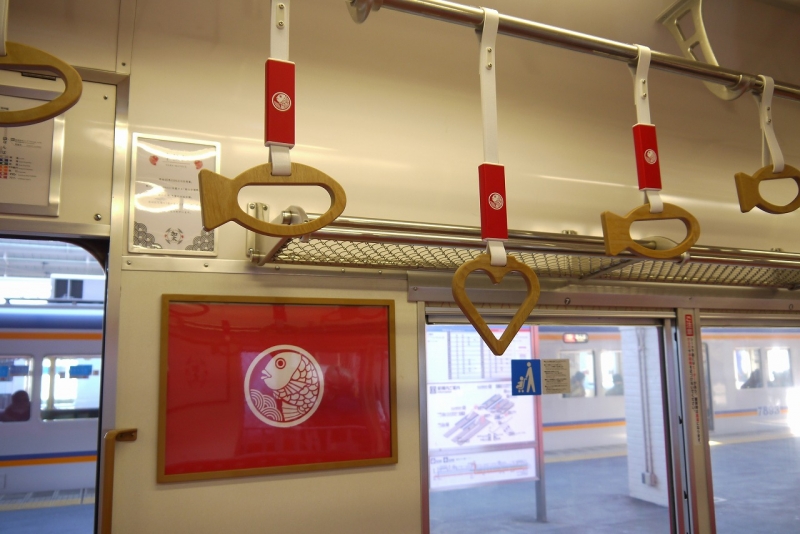 車内には加太名物の「タイ」をモチーフにしたデザインが散りばめられており、座席シートやつり革などにも沢山のタイが。その所々に隠れているハートの形を探してみるのも楽しいです。