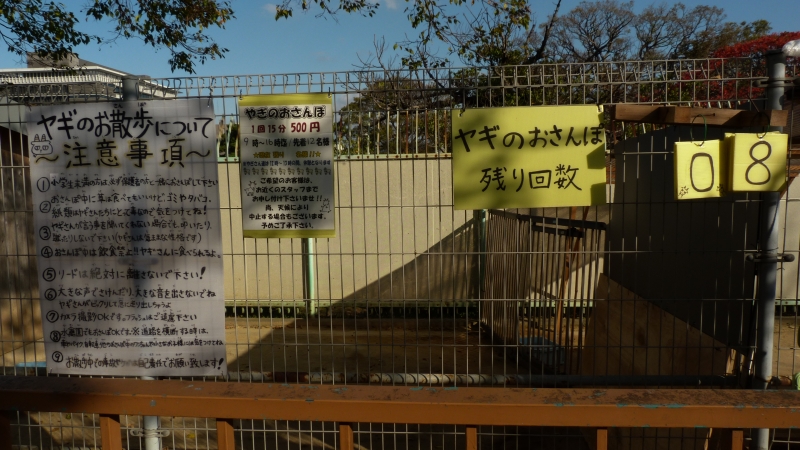 お散歩は1日12回までと決まっており、ヤギのお家の前にその日の残り回数が掲示されています。希望者は物園内の飼育スタッフもしくは動物園事務所まで直接声をかけると、散歩の準備をしてくれます。