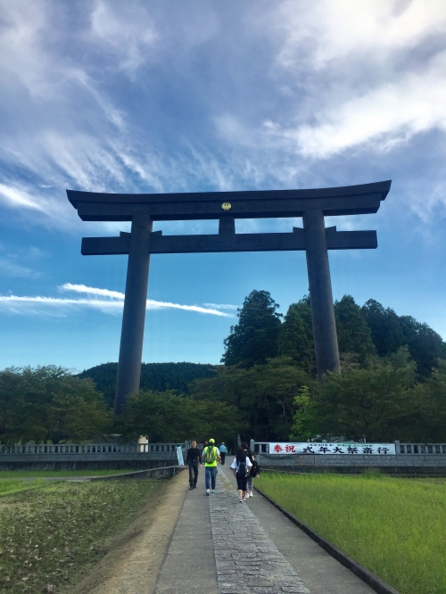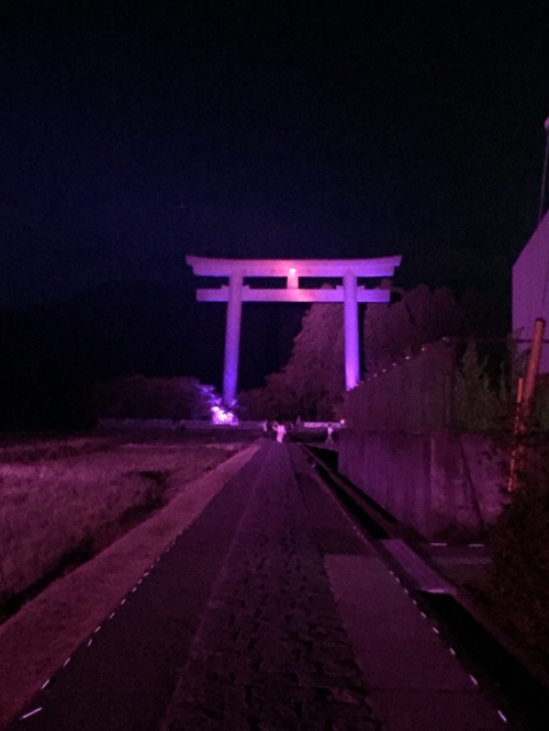 熊野本宮大社から道路を隔てた先に見える大鳥居。その奥にあるのが熊野本宮大社の旧社地である大斎原です。高さ約34m、幅約42mの大鳥居は迫力満点で、元旦や8月に行われる八咫の火祭りなどイベントの際にはライトアップも行われます。