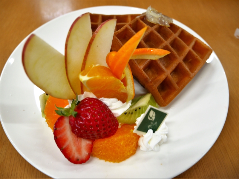 写真は3月上旬のものですが、柑橘やいちご、キウイフルーツなどが美しく盛り付けられていますね。柑橘は、津の望(つののぞみ)、春峰(しゅんぽう)といった、珍しい品種も使われており、味の違いを楽しむことができます。甘さを抑えた生クリームや手作りのみかんジャムとの相性も抜群で、おいしくいただけますよ。
