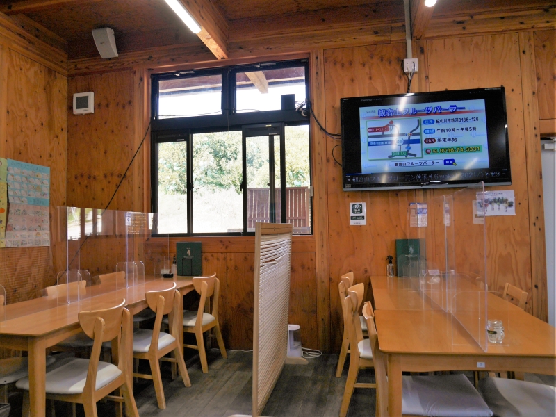 店内は内装に木材が使われており、温かみが感じられます。窓からは、農園に植えられている柑橘の木や紀州の山々が眺められ、心が落ち着きます。風通しの良いテラス席もいくつか用意されています。