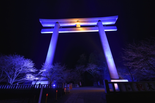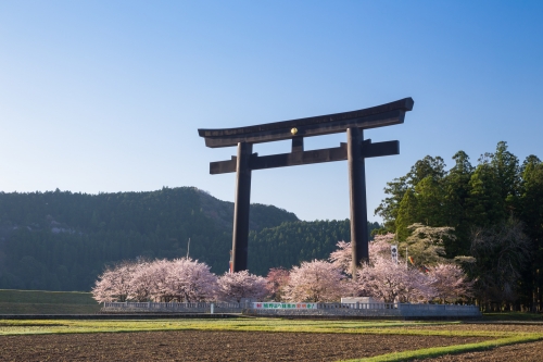 高さ約34m、幅約42mの大鳥居は迫力満点!こんもりとしたかつての神社跡を、今も大鳥居が神域として守り続けています。元旦や8月に行われる八咫の火祭りなどイベントの際には、大鳥居のライトアップも行われ、また桜の名所としても知られています。