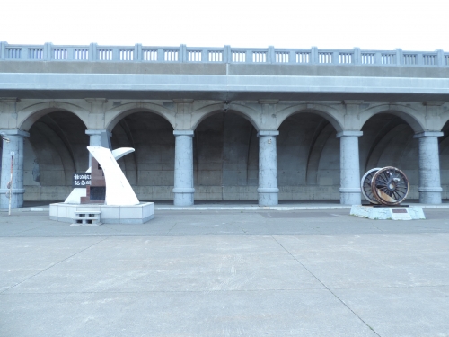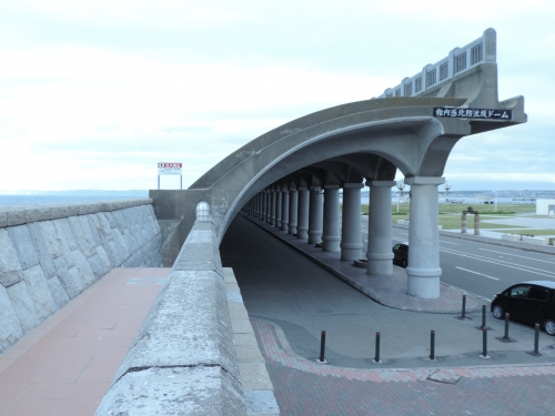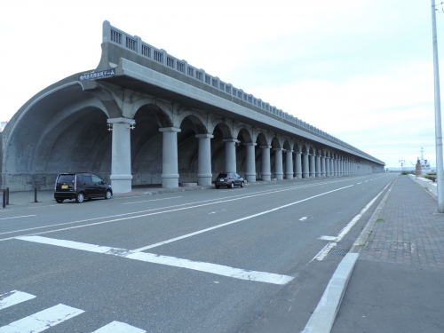 長さ427m、高さ13.6mの波よけ施設です。70本の円柱が連なる半アーチ型のドーム構造で、北海道遺産にも指定されています。