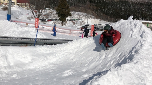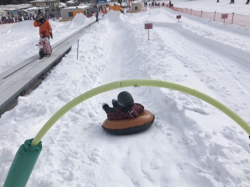 「スノーチュービング」もスリル満点で大人気!浮き輪のようなタイヤチューブに乗って、斜面を滑り降ります。まぁまぁスピードが出て、子供達も「きゃっきゃ♪」と楽しんでいます。