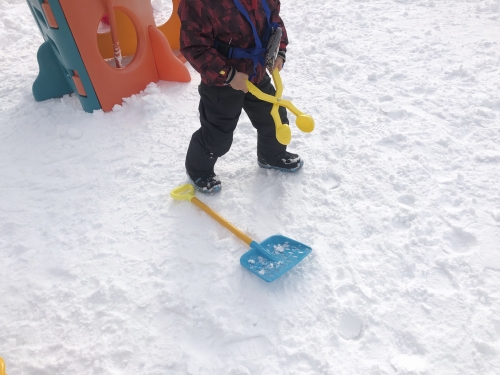 まだソリなどで遊ぶのが心配な小さなお子様は、ひたすら雪で雪だるまを作ったり、登ったり、削ったりして遊べる 穴ほりエリア がオススメ。早朝から、職員さんが柔らかい雪を山のように積んでくれているんです。