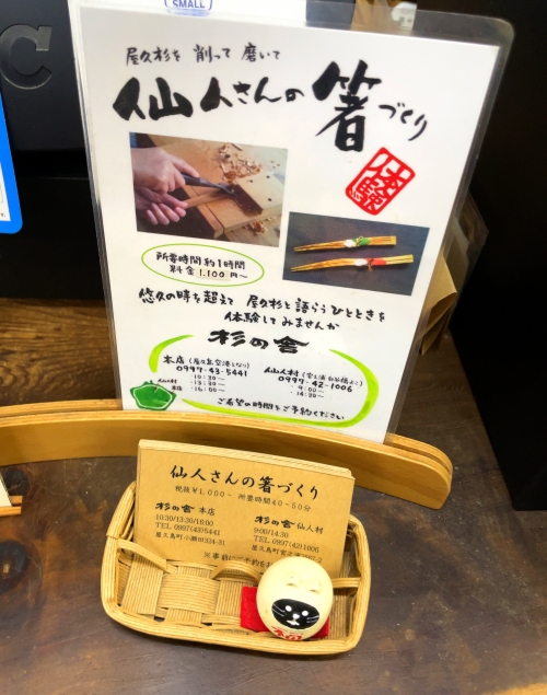 オススメは、千年の屋久杉素材を削って作る、箸づくり体験です。屋久島での思い出に唯一無二のマイ箸を作ってみてはいかがでしょうか?体験は要予約です。