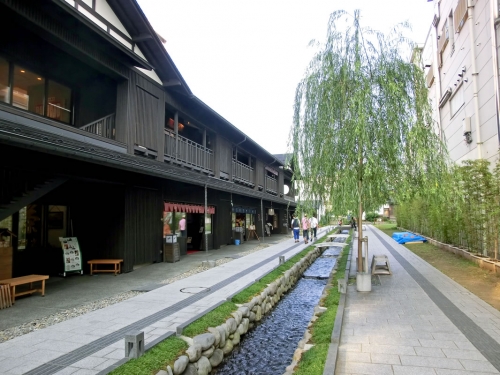 約400年前に生活用水や農業用水を確保するために作られた「山形五堰」のひとつ「御殿堰」を復活させ、堰の景観を利用した商業施設。古いものとモダンが共存する長屋風の建物には、和雑貨店や蕎麦店、レストラン、カフェなどが入ります。