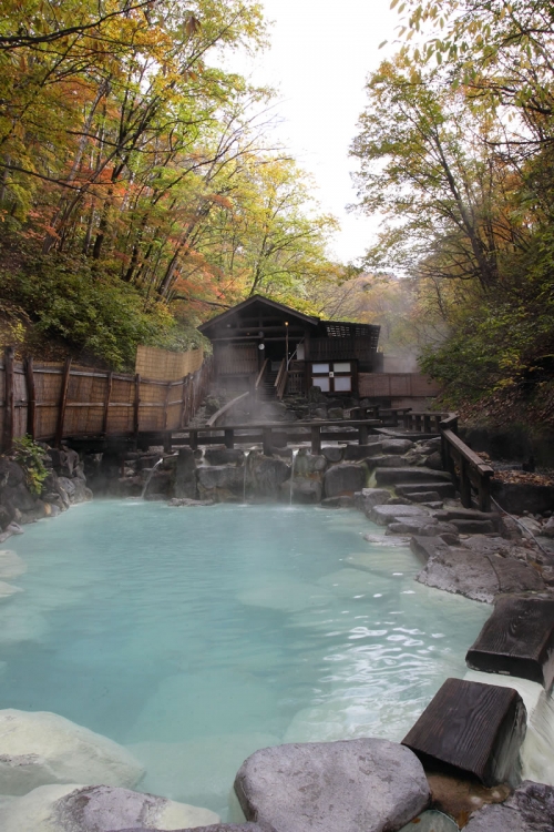 趣のある門をくぐり階段を降りると・・・そこに蔵王温泉大露天風呂はあります。川沿いにあり周囲を木々に囲まれた巨大な露天風呂で、一度に200人入れるという大きさ。開放感溢れる露天風呂につかりながら川のせせらぎに耳を澄ませば、まさに至福のひとときです。上流が女湯、下流が男湯、ぬる湯とあつ湯の2種類の温泉が楽しめます。