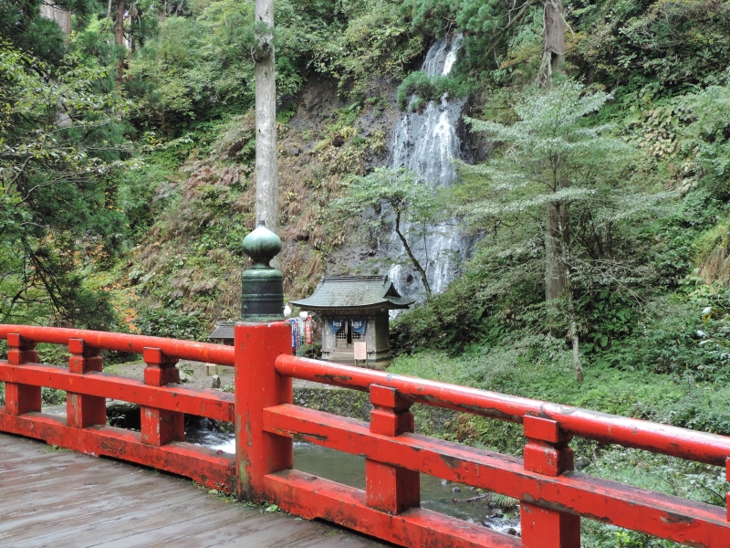 随神門をくぐって唯一の下り坂である継子坂(ままこざか)を降ると、境内を流れる祓川(はらいがわ)にかかる朱色の橋と、祓川に流れ落ちる須賀の滝が姿を表します。昔三山に参拝する人は、必ずこの川で身を清めてから参拝に出向いたという由緒ある場所です。