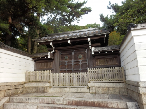 赤間神社の入り口左にある木造の扉。よく見ると菊の御紋が…天皇陵です。ここは入水した安徳天皇の御陵。たった8歳での死でした。