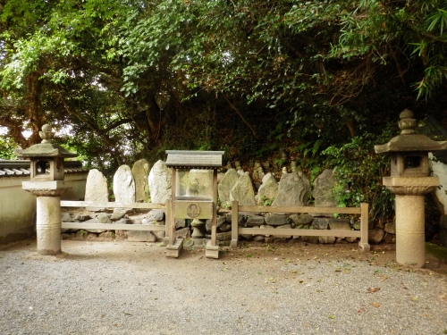 赤間神社の奥、安徳天皇陵の裏のひっそりとしたところには、平家一門の墓があります。七盛塚とも呼ばれ、自然の石の碑が前面と後面に7基ずつ並んでいます。祀られている平家一門の名前が刻まれた石碑も…1,000年近く前のこととは思えないくらいリアルに残されています。