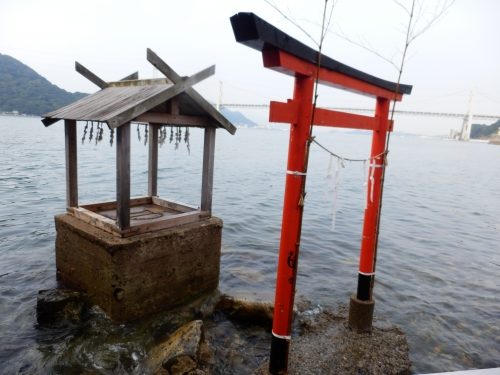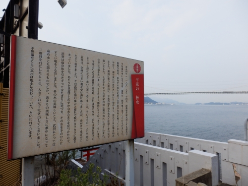 赤間神社からバスに乗り前田の停留所で降り、少し戻って関門海峡の海を見下ろすと鳥居があります。鳥居側には井戸があり、ここから湧き出す水は平家の一杯水と呼ばれています。