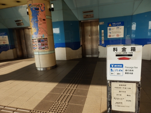 建物にはエレベーターが二つ。エレベーターを降りると関門海峡を挟んで向こうの北九州市門司に歩いていくことができる道があります。自転車でも通ることができますが、料金が必要ですので悪しからず。
