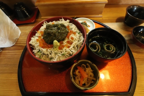 仙崎で人気の和食処「㐂楽(きらく)」では、アカモクを使った海鮮料理を頂くことができます。筆者は、釜揚げしらすアカモク丼を注文しました。たっぷりのアカモクがのっていて、温かいご飯にぴったり。アカモクは粘りがあるので、メカブに似た食感です。