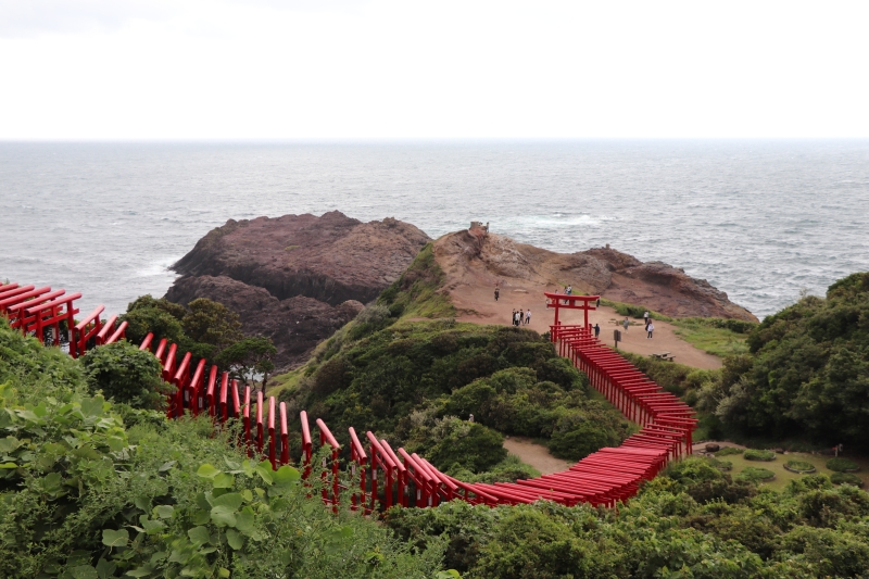 日本海沿いの長門市にある元乃隅神社は、断崖絶壁をうねうねと下るように赤い鳥居が幾重にも連なる絶景の神社として有名な神社です。