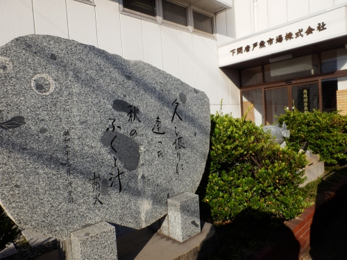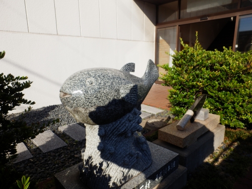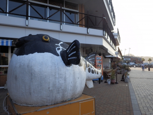 市場以外にあるのはきれいな海だけですが、漁協の入り口には昭和5年に種田山頭火が詠んだ「久しぶりに逢った秋のふくと汁」という碑もあります。ふぐと包丁の銅像も…かわいい!